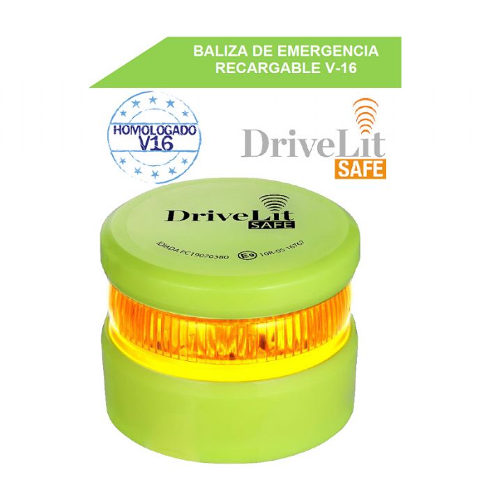 Dispositivo de pre-señalización de peligro V16 DRIVELIT SAFE recargable con toma USB incluida y con base magnética. Su uso está recomendado por la DGT, cuenta con 3 modos de iluminación LED: